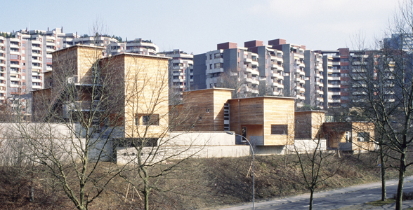 Im Sinne eines ökologischen Umgangs mit dem Land wird die Wiese von Holenacker unbebaut belassen und die Neubauten an der Hangkante situiert. Aus der linsenförmigen Sockelmauer entsteht die Figur eines Schiffes, ein Gerüst für die Phantasieentfaltung der Kinder. Jede Institution erhält ihr Haus, ihre Identität auf dem “Schiff”. Den Kindern ermöglicht dies einen klaren Bezug zu “ihrem Haus”, gleichzeitig ist die Anlage durchlässig für die verschiedenen Altersgruppen. Die drei abgestuften Holzbauten thematisieren den Übergang von der Erde zum Himmel, vom kleinen zum grossen Massstab und machen aus der Hangkante einen erlebnisreichen Ort für die Kinder. Durch ihre gegliederten Volumen vermitteln sie zwischen der Kleinmassstäblichkeit der Kinderwelt und der Grossmassstäblichkeit der Hochhäuser.