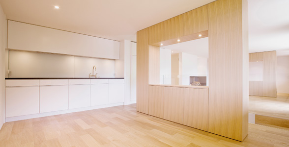 Grundrisstypologie und Wohnungsgrössen entsprachen nicht den Bedürfnissen der neuen Eigentümer. Ziel des Umbaus war, die Aufwertung der Raumqualität und die Erneuerung der Sanitärräume. Eine besondere Schwierigkeit dabei war, die geringe Raumhöhe. Im oberen Geschoss ist ein grosszügiger Wohn/Essraum mit unauffälliger Küche entstanden. Die statisch notwendigen Stützen wurden in zwei freistehenden Möbeln integriert, welche den Raum gliedern aber ihn als Einheit erfahren lassen. Im unteren Geschoss befinden sich die Schlafzimmer.